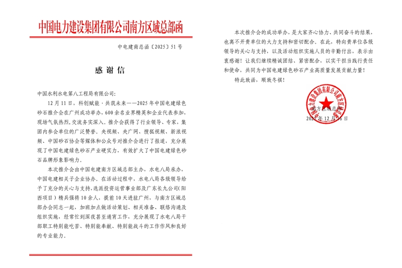 12月16日,工程局接连收到来自股份公司南方区域总部和广东省砂石协会的感谢信。两份饱含认可的感谢信均为表彰工程局在“科创赋能·共筑未来——2025年中国电建绿色砂石推介会”中的突出贡献。 活动于12月11日在广州举行,由股份公司南方区域总部主办、工程局投资运营事业部承办。活动吸引了600余名业界精英参会,气氛隆重热烈、现场交流务实深入,不仅收获行业领导、专家及股份公司内部单位的广泛赞誉,更获央视频、央广网、网易新闻、中国砂石协会等权威媒体与行业平台报道,充分展现了中国电建绿色砂石产业的硬实力。 这份赞誉的背后,是工程局团队不舍昼夜的全力以赴。接到任务后,工程局各级领导充分给予关怀与支持,从投资运营事业部及广东长九公司精选多余名业务骨干,组建专项工作组提前进驻广州,与主办方无缝对接、深度协作。白天细化活动方案、对接参会嘉宾、推演实施流程,确保每个环节精准衔接。夜晚仍坚守岗位,继续完善物料、优化现场保障,全力攻克细节难题。从嘉宾接待到流程把控,从会务支持到应急响应,团队始终以“特别能吃苦、特别能奉献、特别能战斗”的作风,将专业能力融入每一项工作,成为活动顺利开展的“坚实后盾”。 本次活动的成功举办,不仅为砂石行业绿色化、智能化转型注入新动能,更助力工程局绿色砂石品牌价值持续攀升。投资运营事业部与广东长九公司团队凭借实战中的过硬实力,成功打响广东长九项目在粤港澳大湾区砂石领域的品牌名片。同时强化了工程局在绿色砂石产业的行业话语权与央企担当形象,彰显其推动产业高质量发展的核心能力。 当前,广东长九公司即将迎来投产运营的关键节点,工程局上下将以此次获誉为契机,持续深化与股份公司南方区域总部、广东省砂石协会及行业各方的协同合作,把活动中积累的经验转化为发展动能,聚焦绿色生产、科创赋能等核心领域,为中国电建绿色砂石产业升级、广东省砂石行业高质量发展贡献更多力量,以实干书写央企赋能产业转型的新篇章。 | |||||