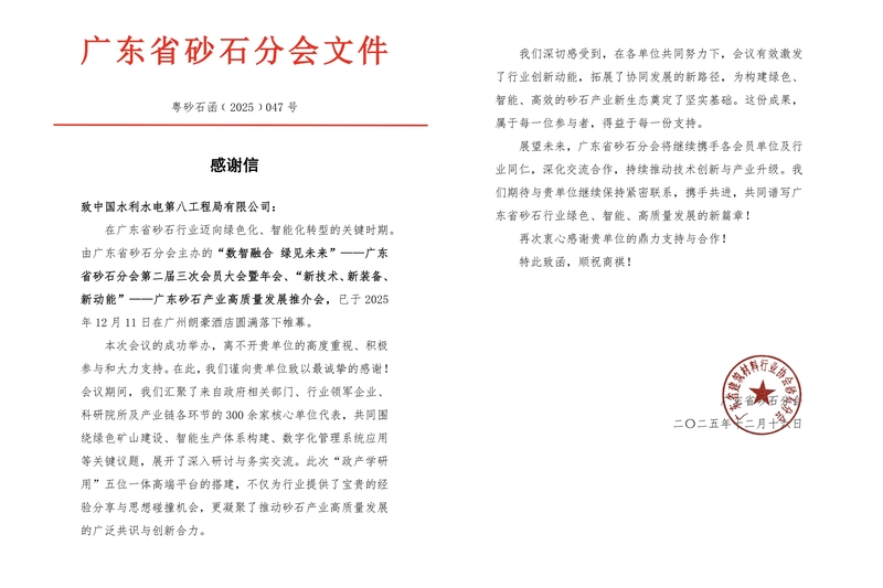 工程局获股份公司南方区域总部、广东省砂石协会感谢信 | |||||
